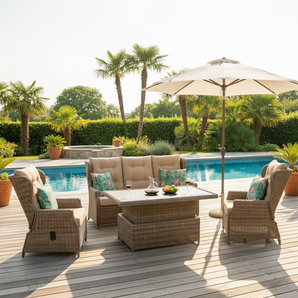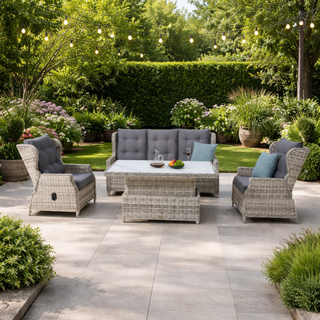 • Designed in Australia • Weatherproof, water repellent • UV protected cushions • Reclining 3 seat and single sofas • Adjustable Up and Down Table |